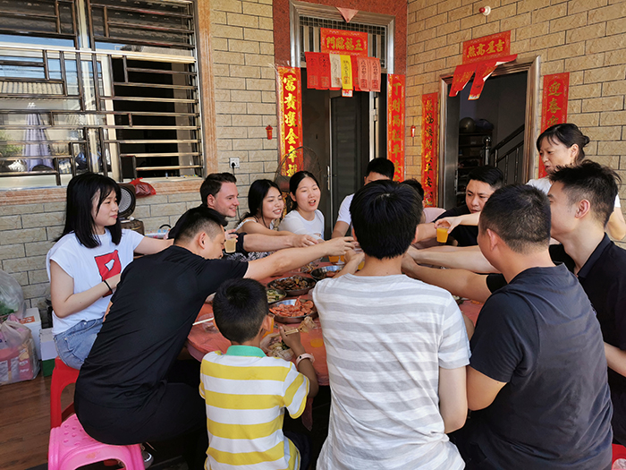 中午,我們進(jìn)住民宿。安頓好行李后,我們共進(jìn)午餐,感覺(jué)到生活的新鮮與愜意。豐盛的佳肴,濃香的美酒,讓我們沉浸在歡樂(lè)的氣氛中,享受著工作勞頓后帶來(lái)的無(wú)比快樂(lè)。舉杯,道聲辛苦了;舉杯,互致祝福。品生活芳香,享生活甘甜。團(tuán)隊(duì)人不光在工作中有拼勁,而且在酒桌上也毫不含糊,舉杯,一飲而盡。