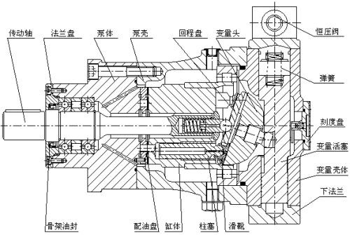 液壓柱塞泵不需要外部的能源,只需要流水的力為它們提供了所需的能量。它們的裝置極其簡(jiǎn)單,只有兩個(gè)運(yùn)動(dòng)的部件,是往復(fù)泵的一種,屬于體積泵,其柱塞靠泵軸的偏心轉(zhuǎn)動(dòng)驅(qū)動(dòng),往復(fù)運(yùn)動(dòng),其吸入和排出閥都是單向閥。當(dāng)柱塞外拉時(shí),工作室內(nèi)壓力降低,出口閥關(guān)閉,低于進(jìn)口壓力時(shí),進(jìn)口閥打開,液體進(jìn)入;柱塞內(nèi)推時(shí),工作室壓力升高,進(jìn)口閥關(guān)閉,高于出口壓力時(shí),出口閥打開,液體排出。當(dāng)傳動(dòng)軸帶動(dòng)缸體旋轉(zhuǎn)時(shí),斜盤將柱塞從缸體中拉出或推回,完成吸排油過程。柱塞與缸孔組成的工作容腔中的油液通過配油盤分別與泵的吸、排油腔相通。變量機(jī)構(gòu)用來改變斜盤的傾角,通過調(diào)節(jié)斜盤的傾角可改變泵的排量。