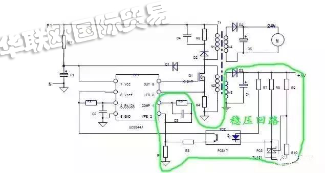 (二)、穩(wěn)壓回路;N3,D3,C5,等的+5V電源,R7-R10,PC3,R5,R6等原件構(gòu)成了穩(wěn)壓控制回路。當(dāng)然PC1芯片和1、2腳及外圍原件R3、C3也是穩(wěn)壓回路的一部分。