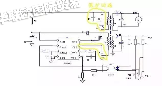 (三)、維護(hù)回路;PC1芯片自身和3腳外圍元件R4構(gòu)成了過電流維護(hù)回路;N1繞組上并聯(lián)的D2,R6,C4,元件構(gòu)成了開關(guān)管的反壓吸收維護(hù)電路;實(shí)質(zhì)上穩(wěn)壓回路的電壓反應(yīng)信號(hào)——穩(wěn)壓信號(hào),也可當(dāng)作一路電壓維護(hù)信號(hào),但維護(hù)電路的內(nèi)容并不僅局限于維護(hù)電路自身,維護(hù)電路的啟控往往是因?yàn)樨?fù)載電路反常所引起的。