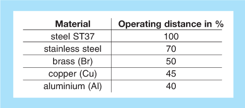 操作距離受物體材料的影響:不同材料對(duì)鋼ST 37的恒定尺寸產(chǎn)生改變的操作距離。下表列出了材料相關(guān)減少因子的近似值。在實(shí)際應(yīng)用中,例如,由于不同的合金化,可能發(fā)生變化。