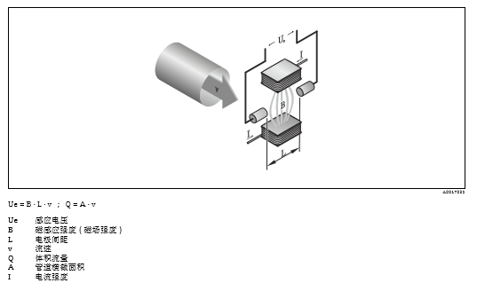 根據(jù)法拉第電磁感應(yīng)定律,導(dǎo)體在磁場(chǎng)中運(yùn)動(dòng)時(shí),會(huì)產(chǎn)生感應(yīng)電壓。 在電磁測(cè)量原理中,流動(dòng)的介質(zhì)相當(dāng)于運(yùn)動(dòng)的導(dǎo)體。 感應(yīng)電壓與介質(zhì)流速成比例關(guān)系。兩個(gè)測(cè)量電極檢測(cè)感應(yīng)電壓,并將其傳輸至信號(hào)放大器。基于 管道橫截面積,計(jì)算介質(zhì)的體積流量。極性交替變換的開關(guān)直流電產(chǎn)生直流(DC)磁場(chǎng)。