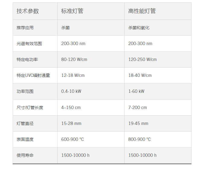 5、德國HERAEUS紫外線燈管技術(shù)參數(shù)對比