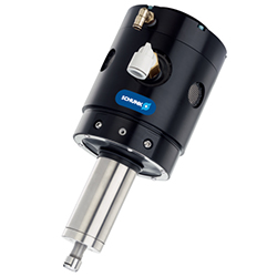 ①通過扭矩最大為65,000轉/分(取決于模塊尺寸)的氣動主軸進行裝置傳動。主軸可旋轉安裝,以保持整個機加工輪廓的公差。刀頭處的最大行程為±9 mm。移動(振動)主軸需要力(硬度)。其受第二個空氣接口控制。根據(jù)壓力不同,作用于銑削表面的力為3.1 N至89 N。